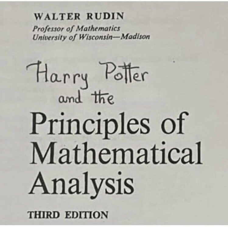 This funny image shows the cover of a math book called “Principles of Mathematical Analysis” by Walter Rudin. But someone wrote “Harry Potter and the” above the title, making it look like a magic storybook. It’s a clever joke because math is often very hard and feels like magic to many students. This book is famous in college and is also called “Baby Rudin.” Many people use this book to study advanced math. By mixing Harry Potter and math, this meme becomes both funny and smart. It is perfect for students, teachers, and fans of math humor. If you like math jokes, study memes, or Harry Potter memes, this image will make you laugh. It is now trending online in student groups and meme pages. Share this funny math meme with your friends who love math, magic, or both!